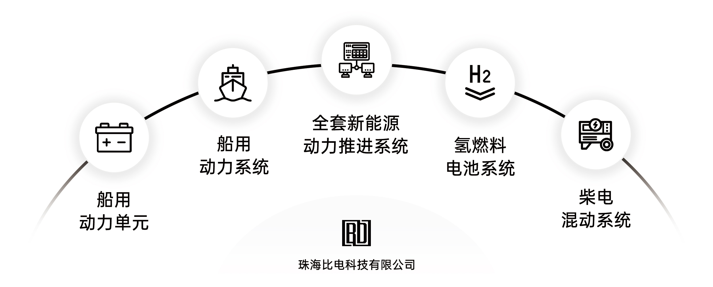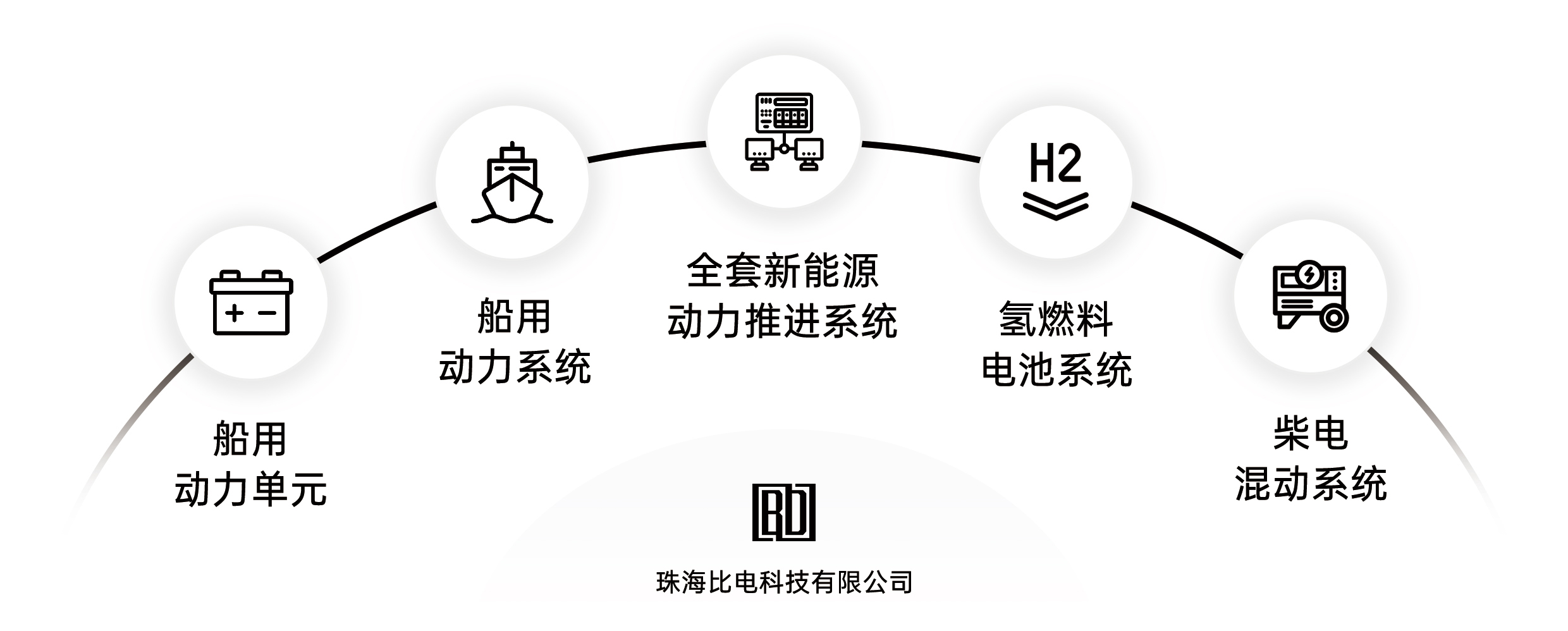 业务范围 Business scope 船用动力单元 船用动力系统 全套新能源动力推进系统 氢燃料电池系统 柴电混动系统 珠海比电积极布局电动船舶领域以技术和产品不断推动电动船舶新能源市场的发展主要业务包含如下图: 船用动力单元 Marine power unit 为中小型船舶研制,产品具有 “高功率、长续航、高安全、长寿命” 等核心优势,适配船艇各方面性能需求,助力项目成功,实现全程纯电航行,为国内外内河及沿海航运减排提供优质的经验和方案。主要产品为L50、L083系列、L118系列、L143系列、L010Y1、船用集装箱式电源。 船用电池系统 Marine battery system 适用于多品牌各型号的电力推进系统。我们推出的系统具有高可靠性、高安全、长寿命和高能效。 结合“可再生能源”提供极致的环境友好方案,在全生命周期内更具优势,我们的系统可对输入和输出做出智能化的管理,根据负荷情况及时调整,保障船舶安全、稳定、高效、低成本运行。 氢燃料电池系统 Hydrogen fuel cell system 全面掌握氢燃料电池核心技术,专注于电堆的设计与开发及系统集成,并根据市场应用的性质与终端产品制造商合作,提供电堆及系统销售与技术服务。面向车用、船用、分布式发电和电源等领域提供产品及行业决方案。 世界领先级电堆技术,功率密度4.6kW/L 模块化高集成设计,体积更小、成本更低 市场批量化验证,技术成熟可靠 针对船舶需求及法规设计 安全可靠模块化设计 可按需扩展结构紧凑,安装使用便捷 柴电混动系统 Diesel electric hybrid system 柴电混动系统是一款专为船舶多种设备长时间用电而开发的分布式供电系统。产品兼具发电与储能功能,由发电机组供电,储能系统存电与放电,结合能量管理系统与智能云平台监控,为客户提供安全可靠的一站式解决方案。